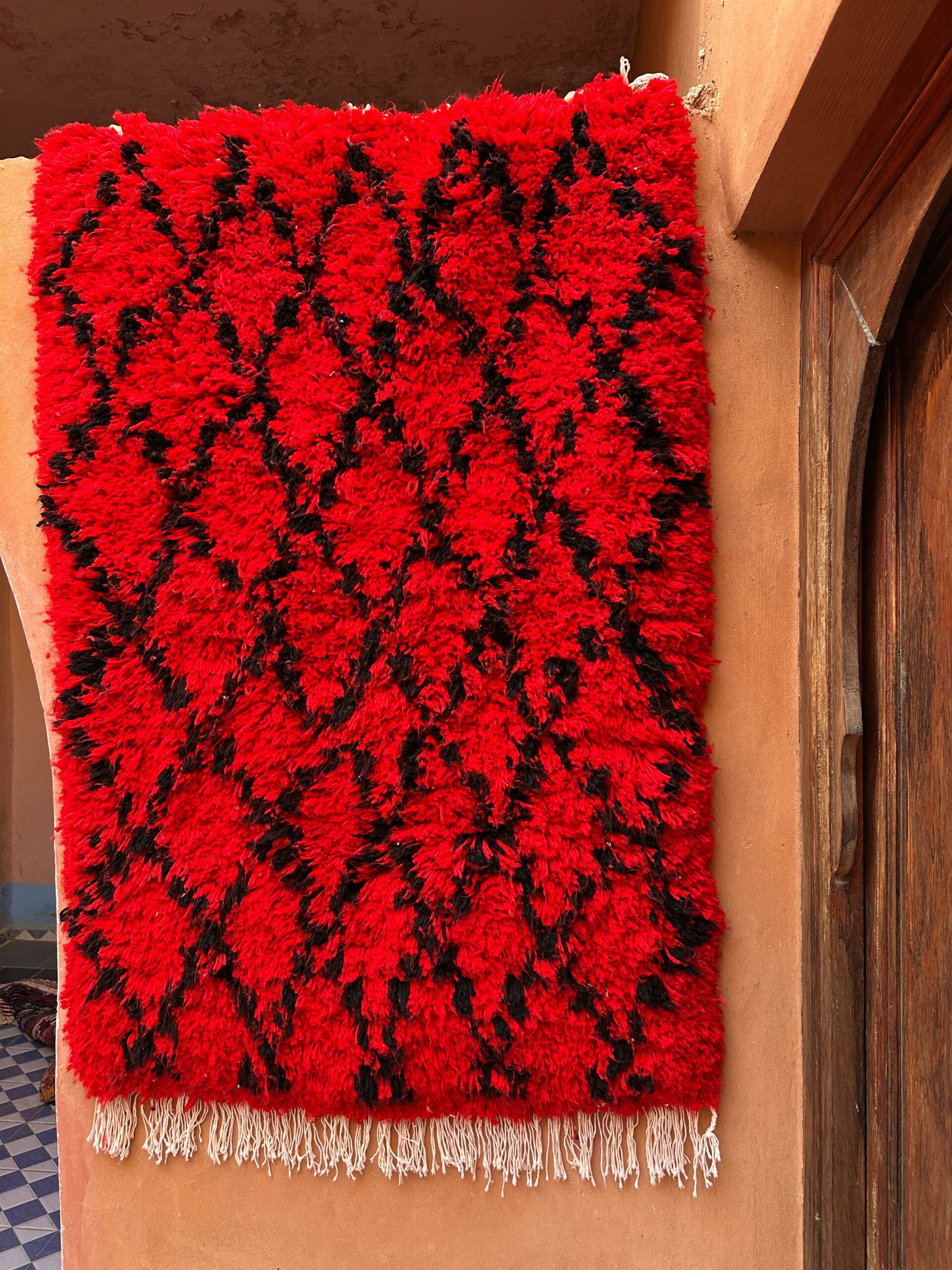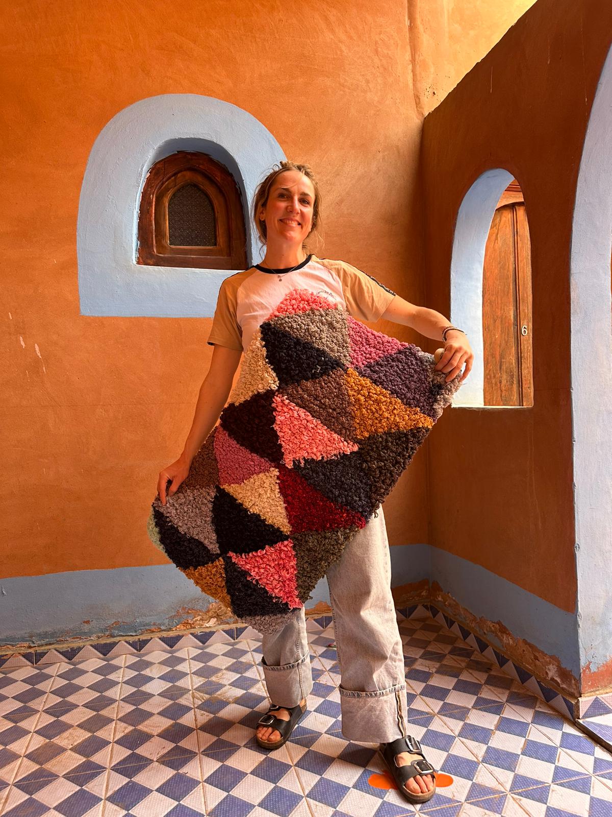 Ce tapis coloré a été réalisé par Boumezzough depuis la ville de Gourrama aux pieds des montagnes de l’anti atlas marocain.