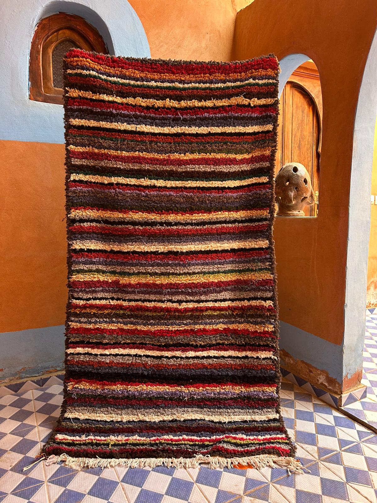 Ce tapis unique a été tissé avec créativité et talent par Ibtissam, en recyclant la trame d’un sac de farine avec de petites formes géométriques aux couleurs douces.