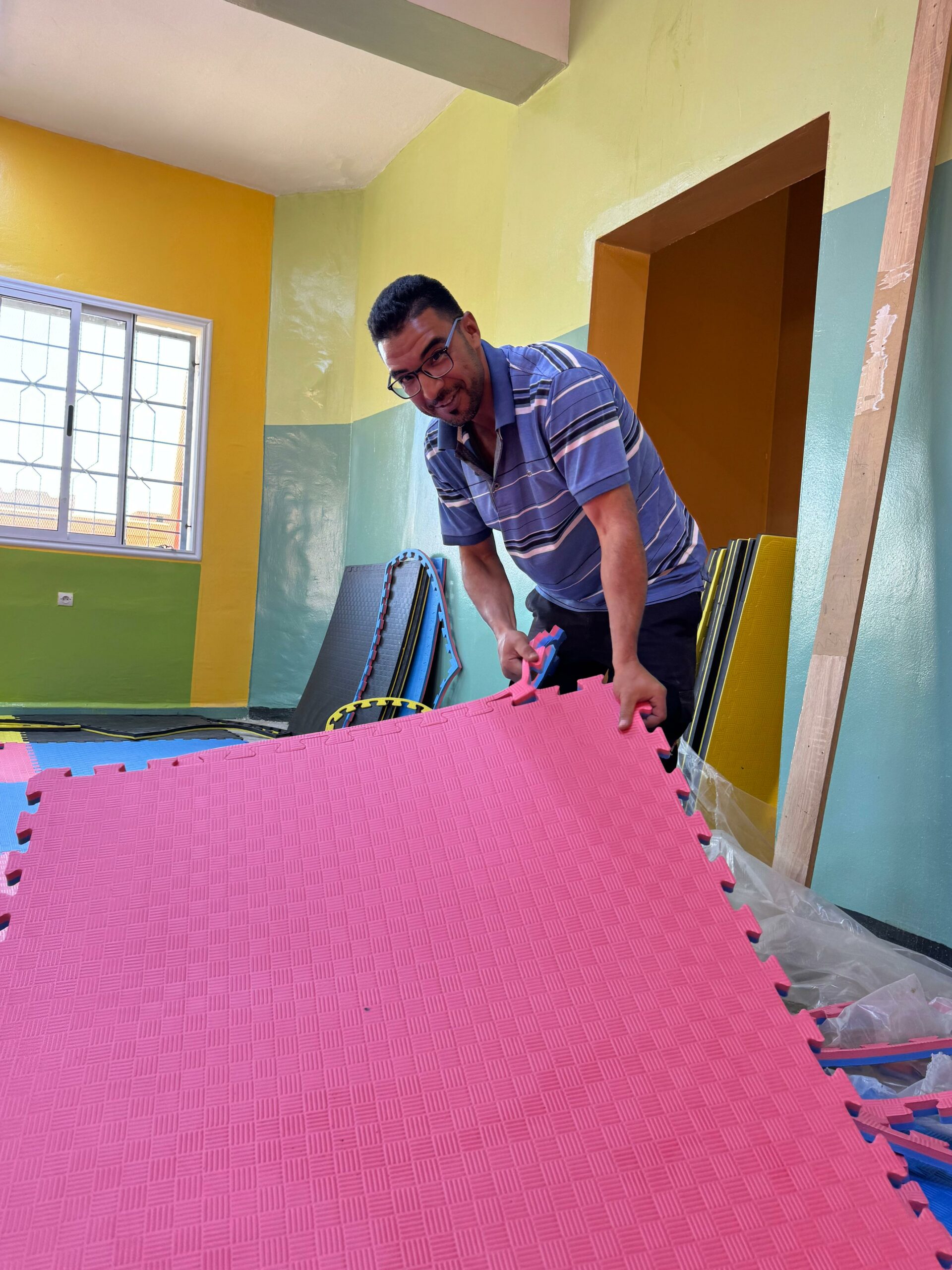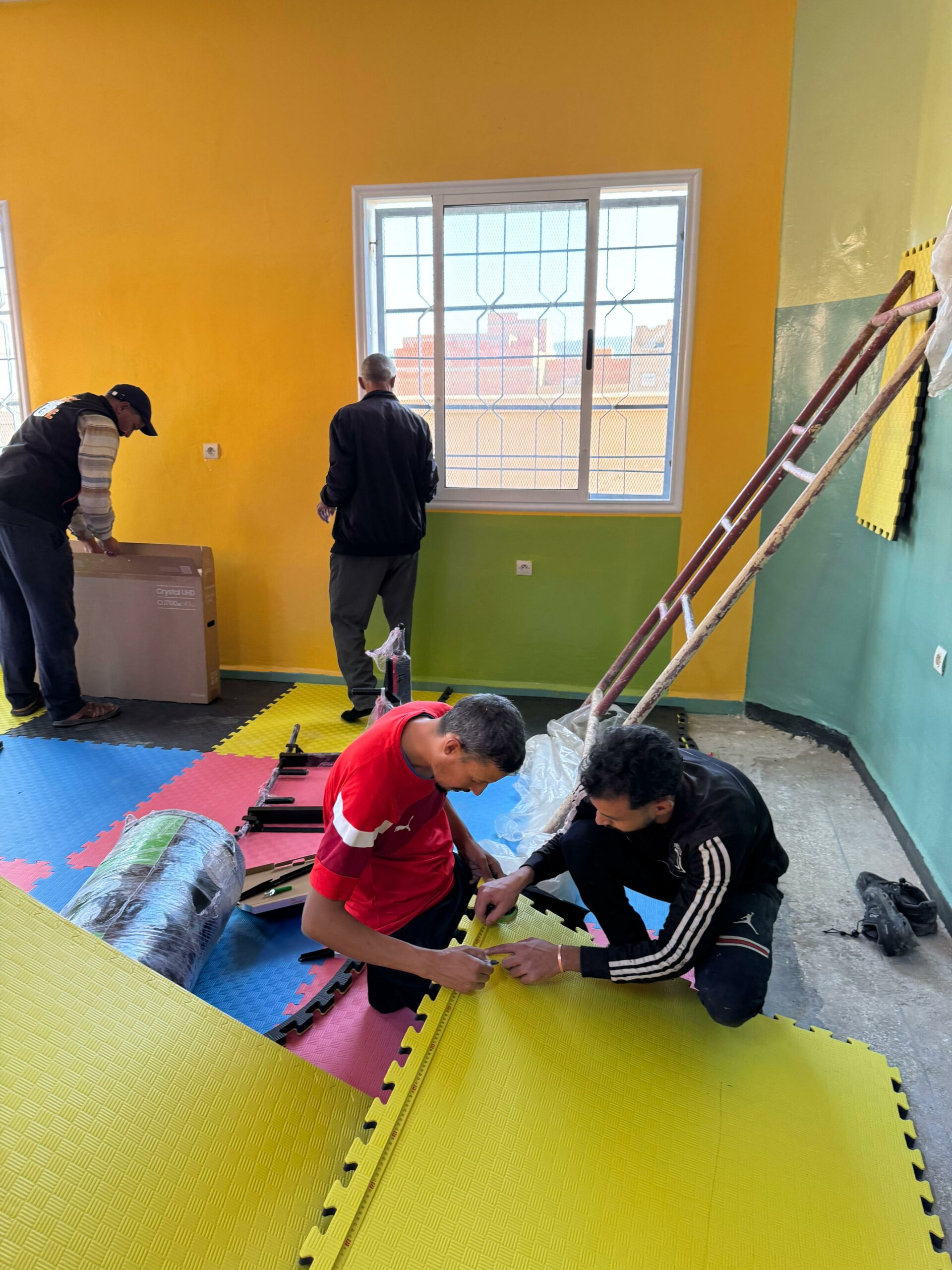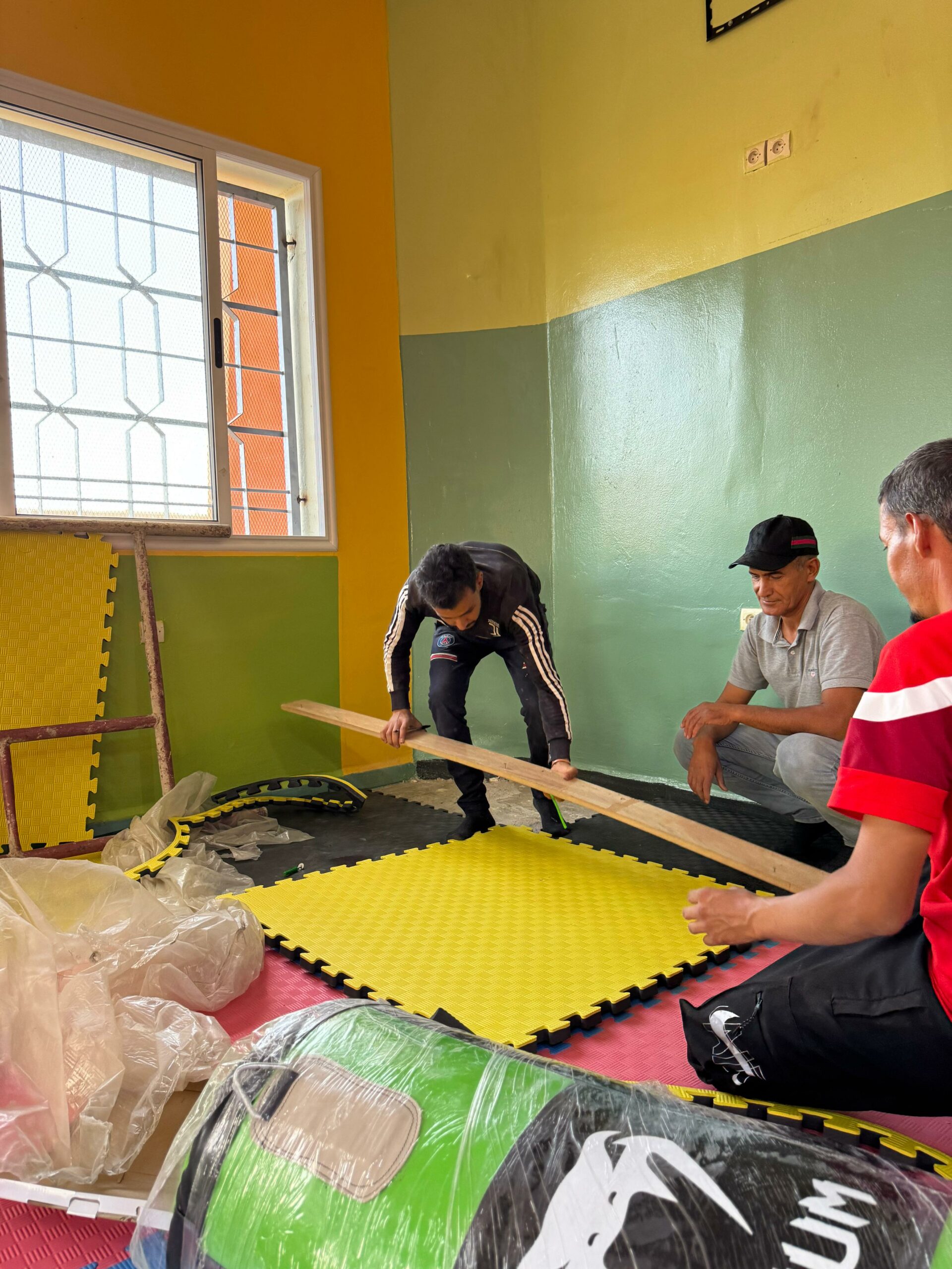 Tout le monde a ensuite mis la main à la pâte pour installer l’équipement et aménager la salle. Dans la joie et l’enthousiasme de voir naître cette salle sous leurs yeux !