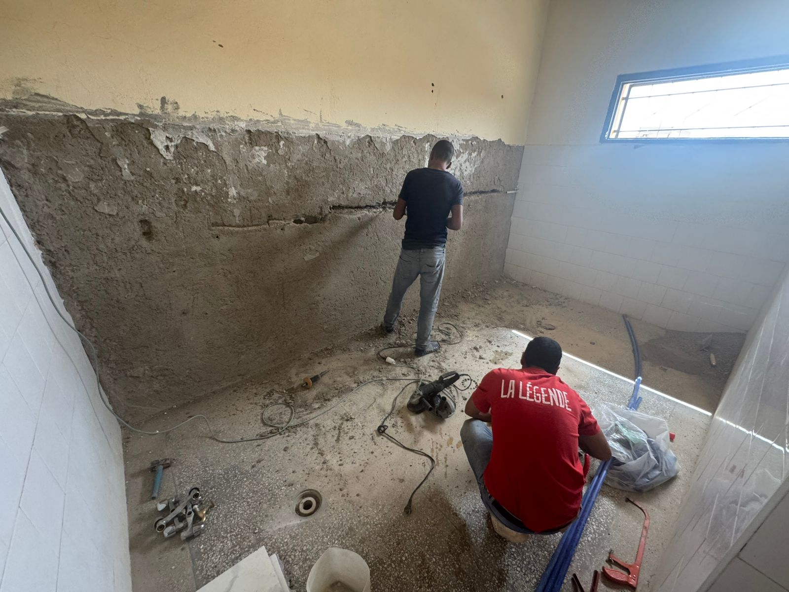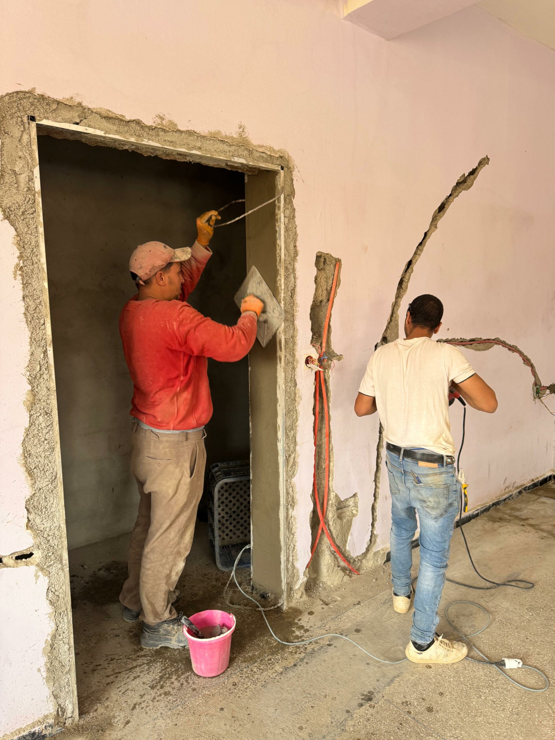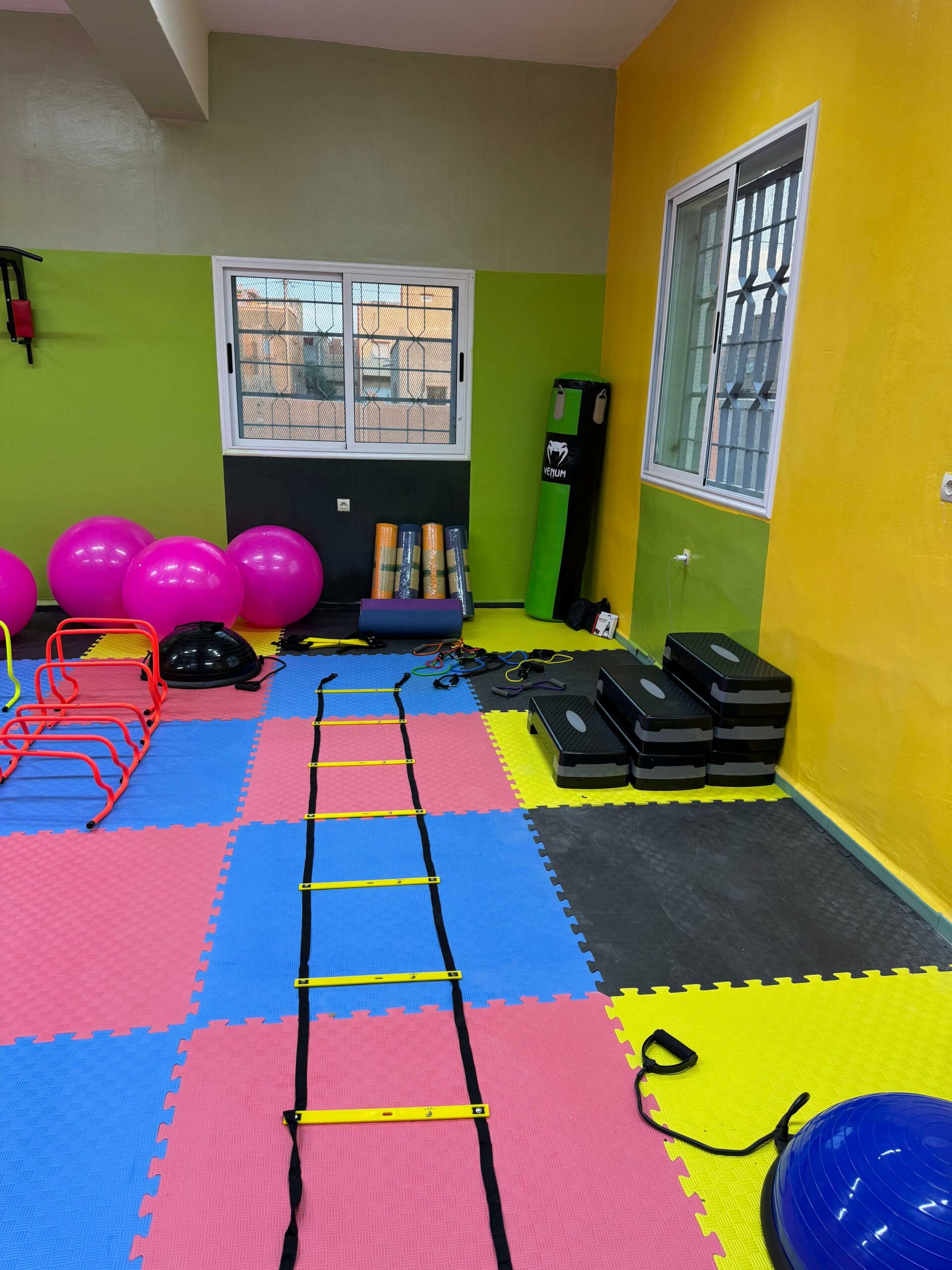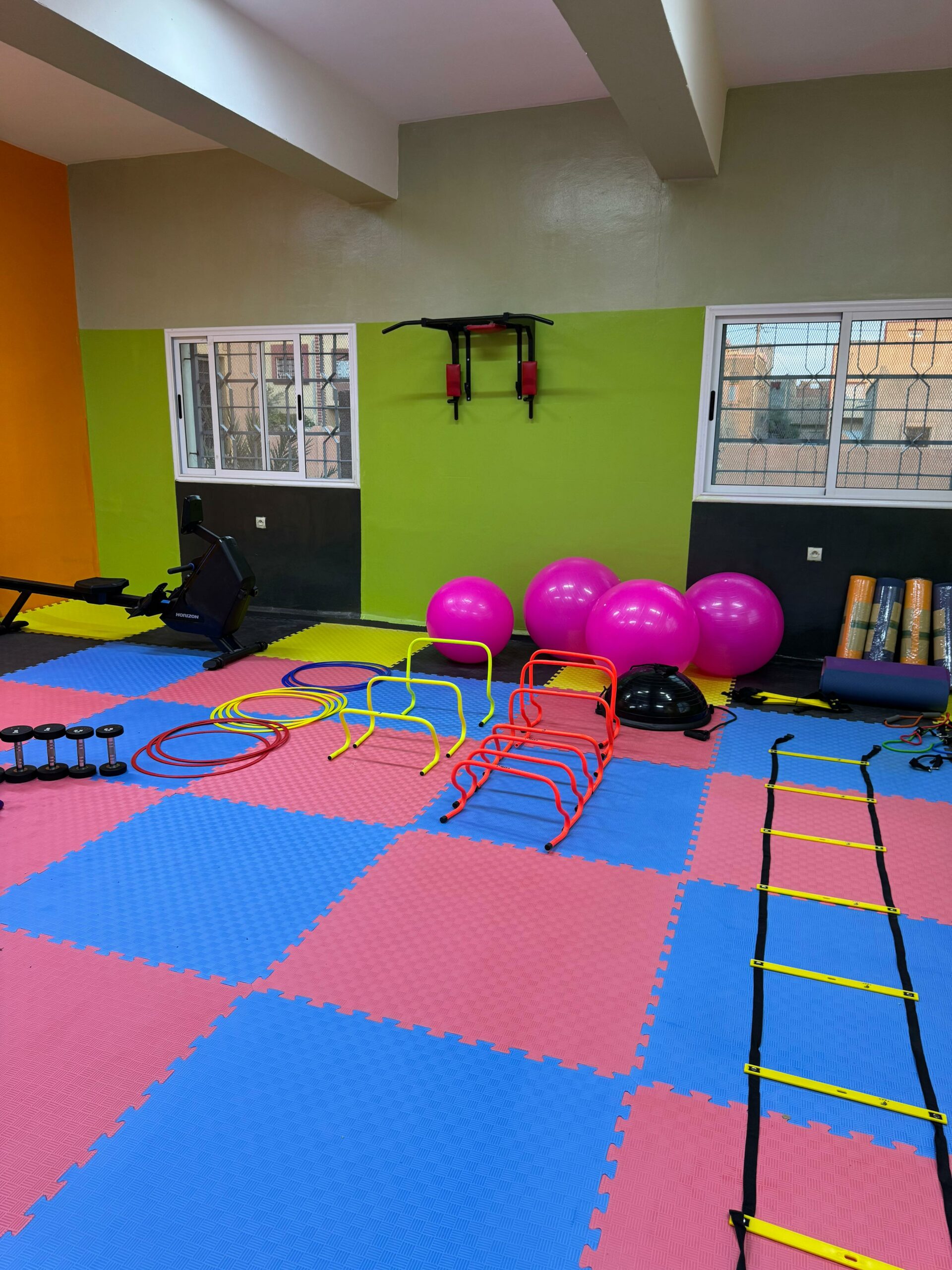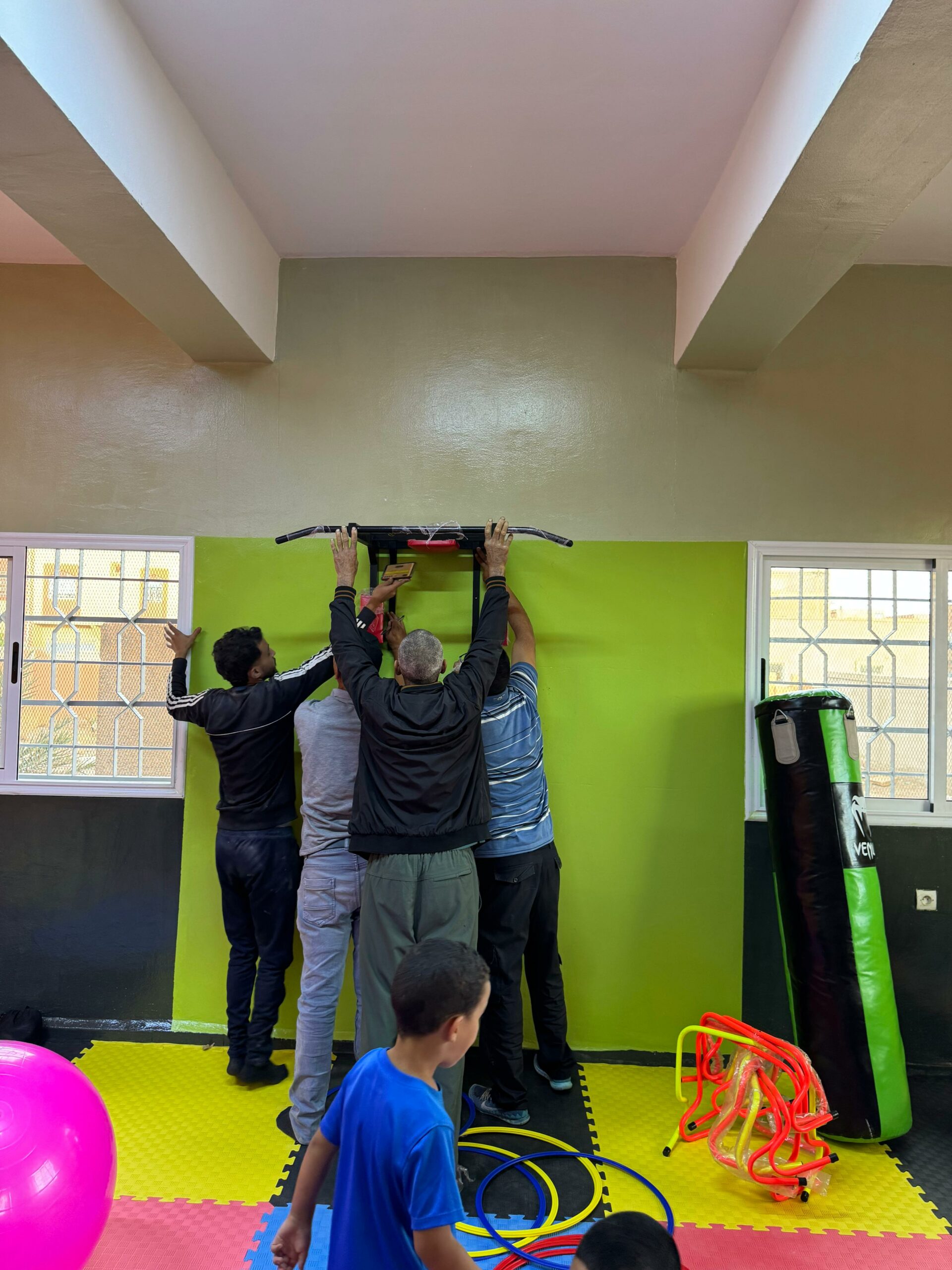 La salle de sport a été créée dans une ancienne salle de classe, que nous avons réhabilitée. Il y avait quelques travaux d’assainissement à réaliser à l’étage avant de pouvoir aménager la salle. Ces travaux ont été effectués par notre équipe locale de maçons 🔩.